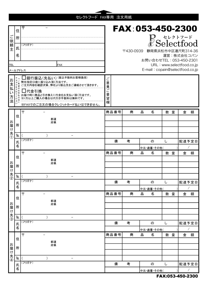 お名前、ご住所、お届け先など、必須事項をご記入の上、FAXにてご送信ください。